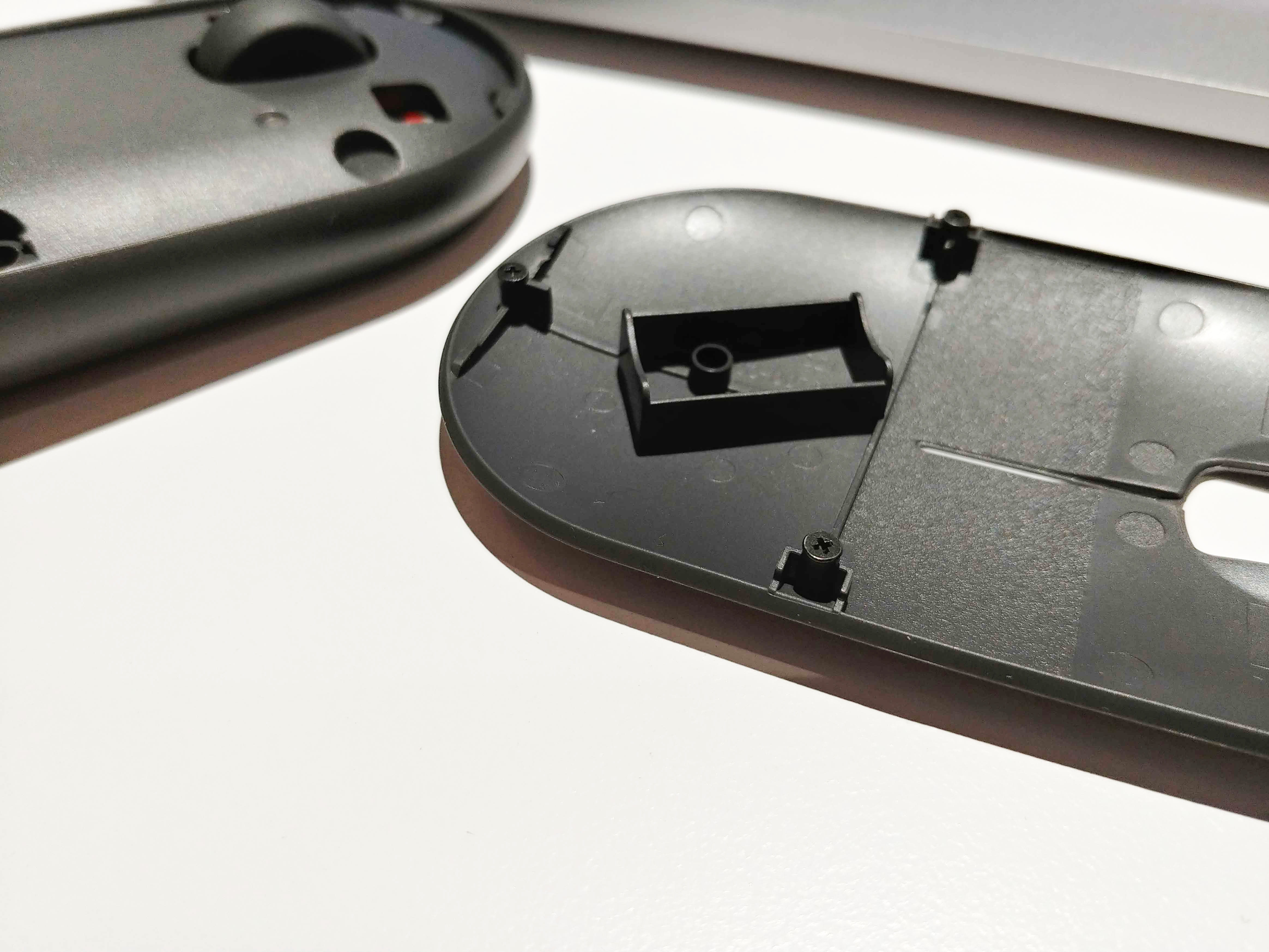 특히 이렇게 상판을 여는 구조가 기존의 걸쇠형이 아닌 자석형인 점이 특이하다. 상판은 3군데의 작은 자석으로 연결이 되며 덮개를 열면 리시버, 건전지, 스위치 부분까지 모두 노출되는 형태다. 작은 힘으로 열 수 있지만 그렇다고 일상생활에서 의도치 않게 열리는 정도는 아니다. 오히려 이렇게 잘 열리는 구조가 마우스를 떨어뜨렸을 때 충격을 분산시키는 효과도 있을 거 같다.
