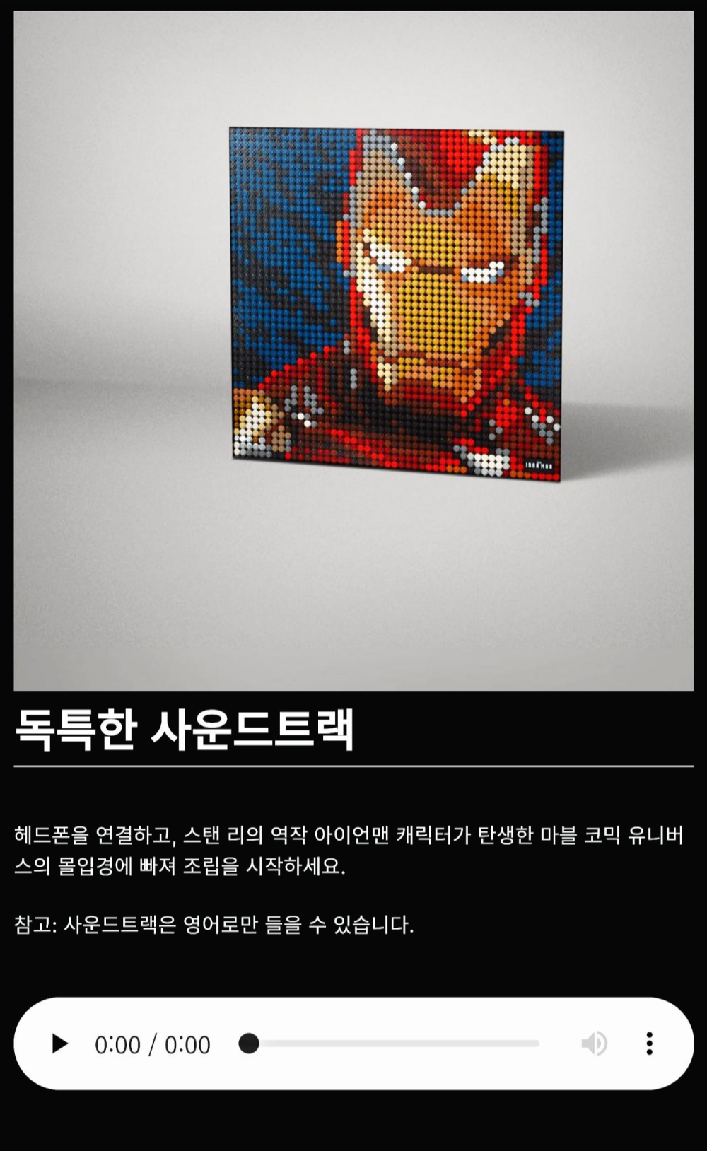구성품은 레고 부품이 담긴 여러 개의 봉지들, 설명서 그리고 특이하게 soundtrack을 표시한 그림과 QR코드가 있었는데 이를 찍어보니 영어로 된 대화가 흘러나왔다. 알고 보니 이 대화를 들으면서 제품을 조립하라는 의미인데 처음엔 이런 게 왜 있을까 궁금했지만 조립을 시작한 지 얼마 안 되어 그 이유를 알 수 있었다.